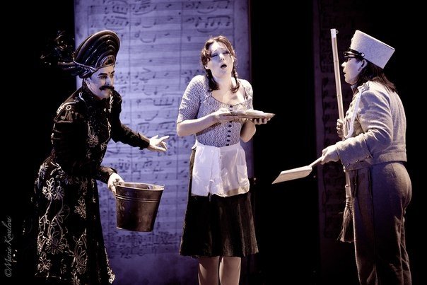 Пожалуй, именно она, музыка, и является главным персонажем «Золушки» в Театре «Зазеркалье». Недаром основные декорации на сцене — это большие, выше человеческого роста, нотные листы. Актеры поют на итальянском языке, то есть играют роль не рассказчиков, а еще одного инструмента в общем оркестре.